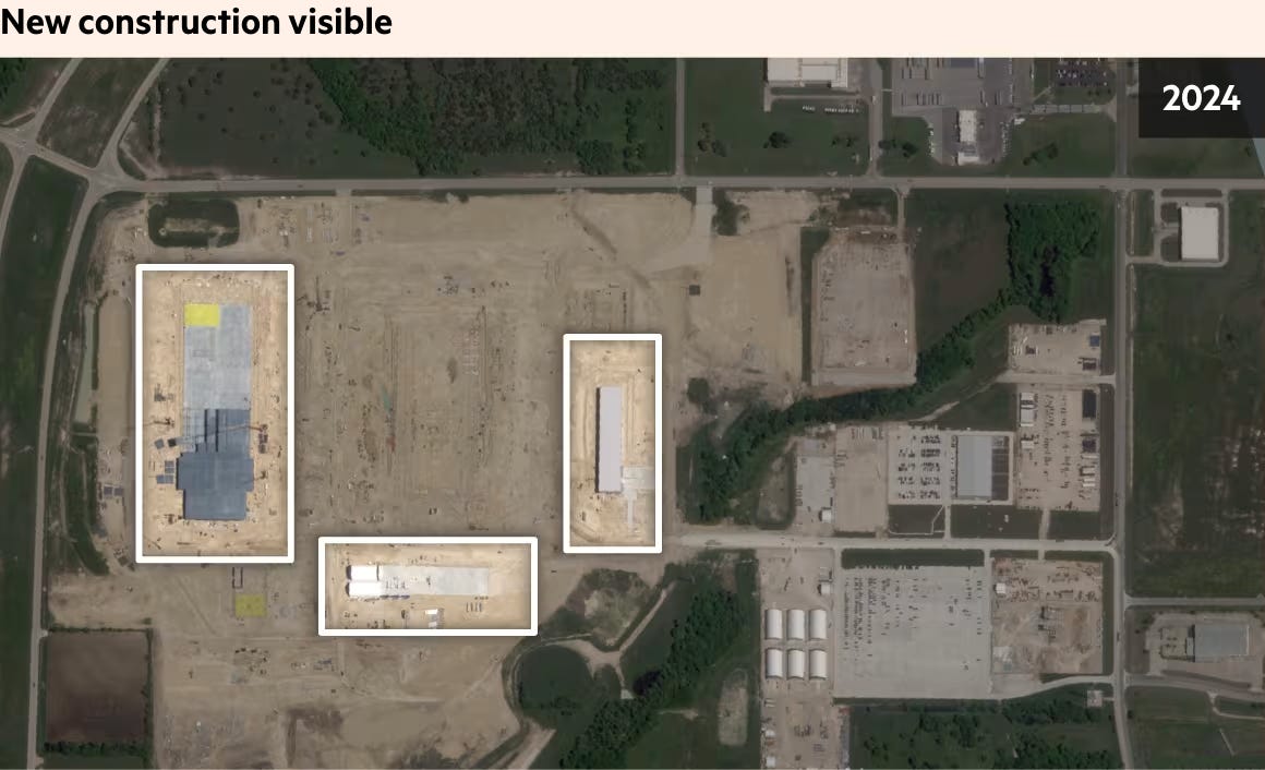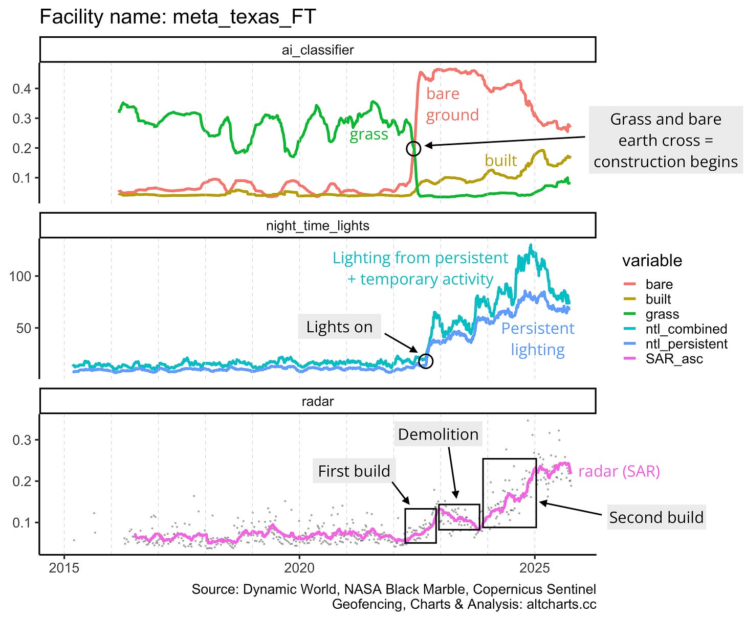 The Financial Times article examined several data centers, with Meta’s Texas facility receiving the most detailed coverage. As such, we focus on replicating the satellite signature for this specific site. In this section, we compare the FT’s optical imagery and storyline with our radar data — providing the most direct, apples-to-apples comparison.