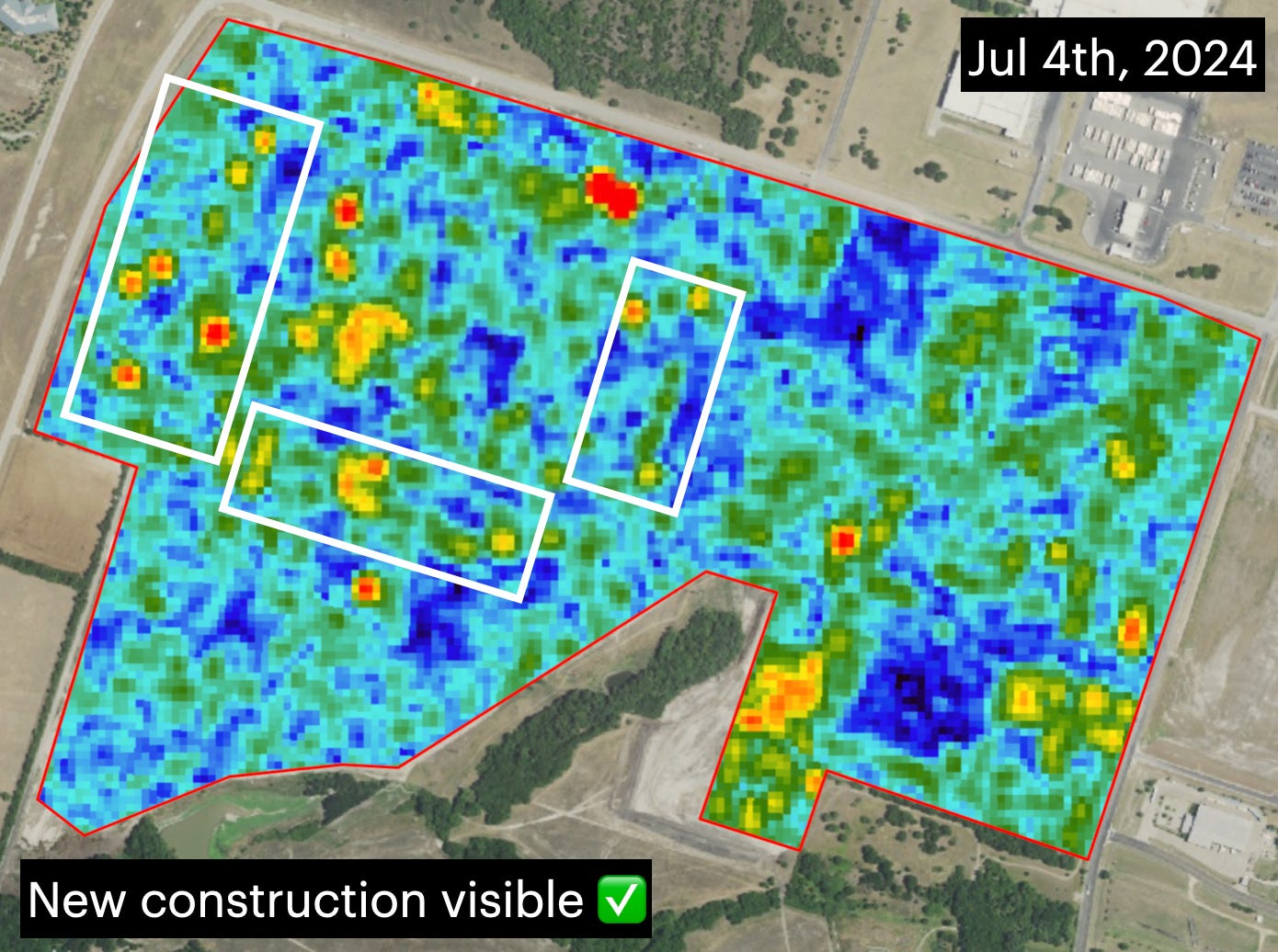 Between January and November 2023, radar (SAR) readings declined, suggesting site rearrangement or partial deconstruction (more reporting here). By February 2024, the radar signature (SAR) rebounds and surpasses previous levels, indicating renewed activity and expansion.